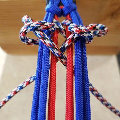 RWB 550 Paracord Bracelet. This bracelet is done with a six strand core. Four of the strands are electric blue and the other two are imperial red. Surrounding the cord is a 550 paracord called patriot. Patriot is a red, white and blue combination color that is fairly new to the 550 paracord family of colors. The bracelet is 1 3/8" wide and just under 1/2" thick.